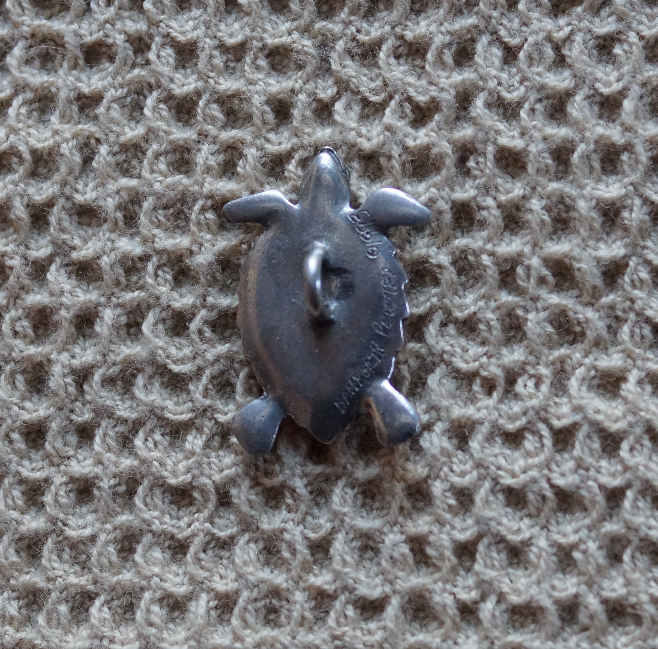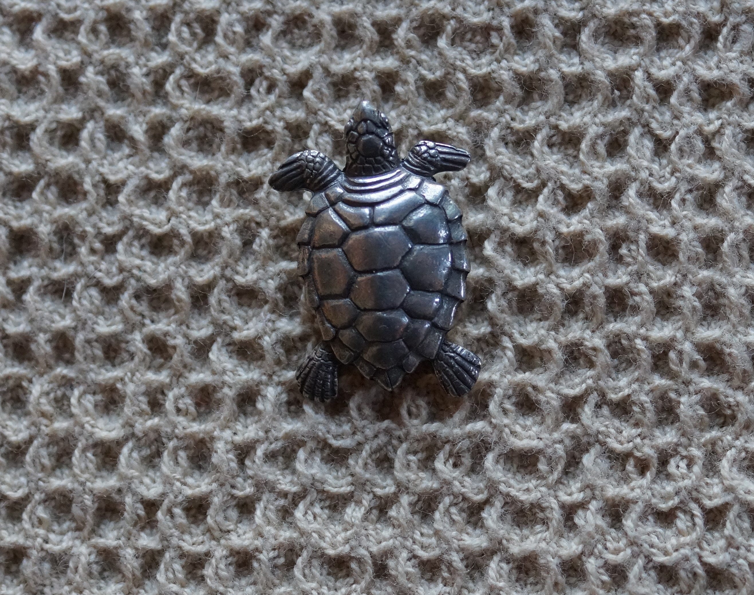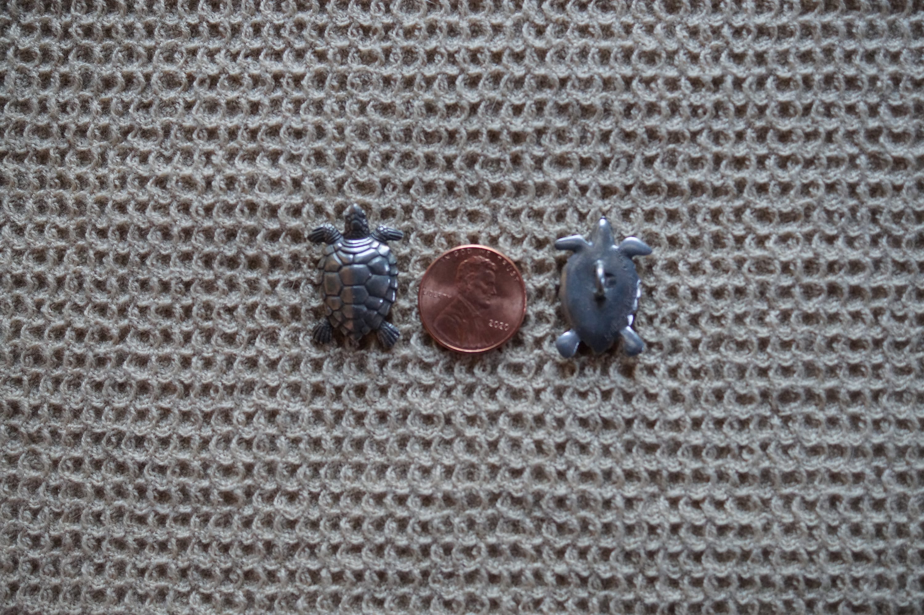 TURTLE Danforth pewter shank button. About 7/8" high. Vintage button. Made in Vermont. Machine washable & dryable. Also, can be dry cleaned. About 1 inch long by 9/16" wide. Free shipping for orders of $35.00 or more. See more buttons at www.generalbaileyfarm.com